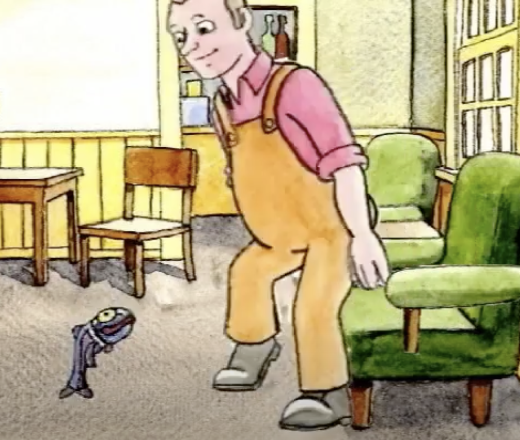 Fhruig e dhachaigh 's bha a' sgadan aige. 'S bha e 'coimhead air is bha e car leisg air a mharbhadh. Thug e ás a' bhucaid uist' e 's bha e 'coimhead air 's bha e aig' ás cóig mionaidean. Chuir e air ais dha 'n bhucaid e agus bha a' sgadan a' snàmh mu 'n cuairt. Bha e 'coimhead air agus thug e ás e an uair sin deich mionaidean.